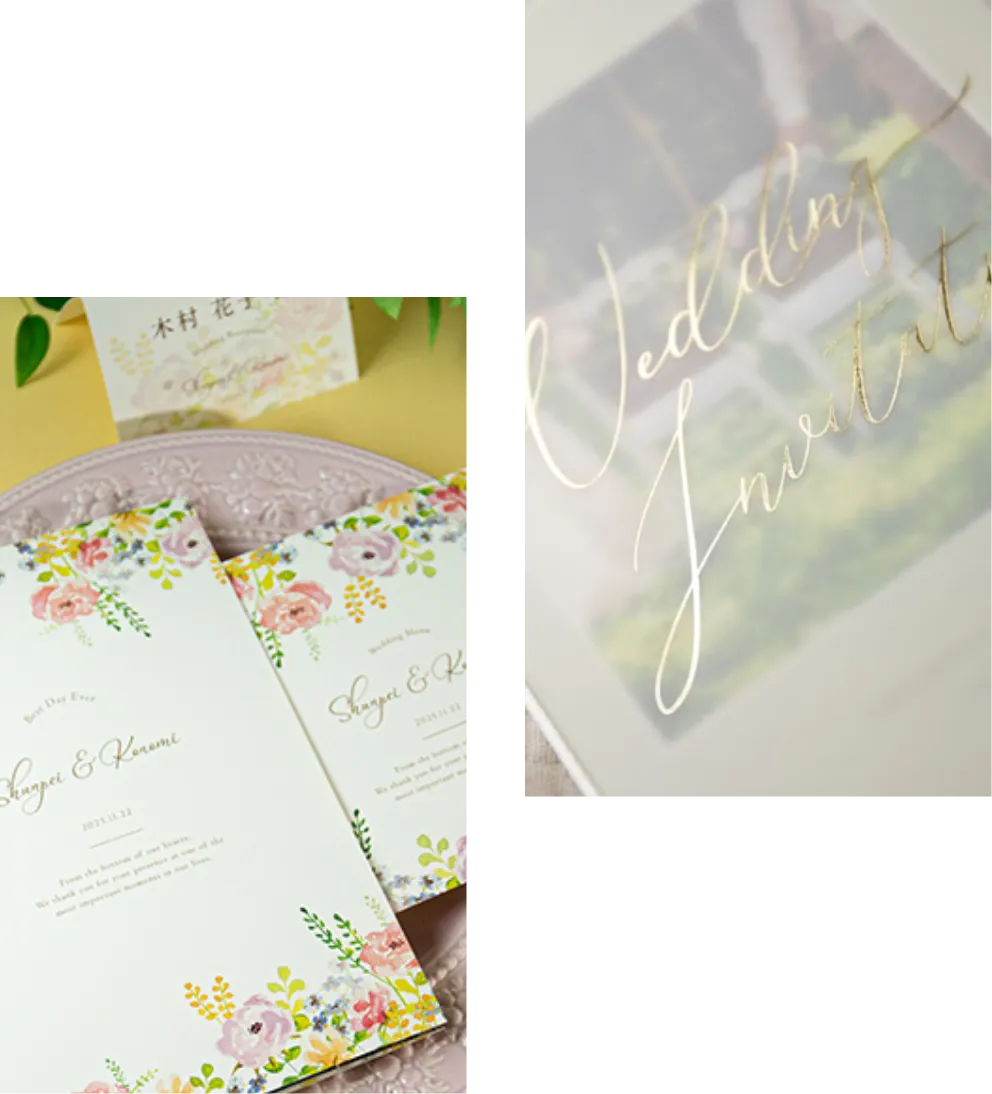 思い出を形に残したい方は紙の招待状、お金をあまりかけたくない方はWEB招待状など、さまざまな招待状をご用意しております。