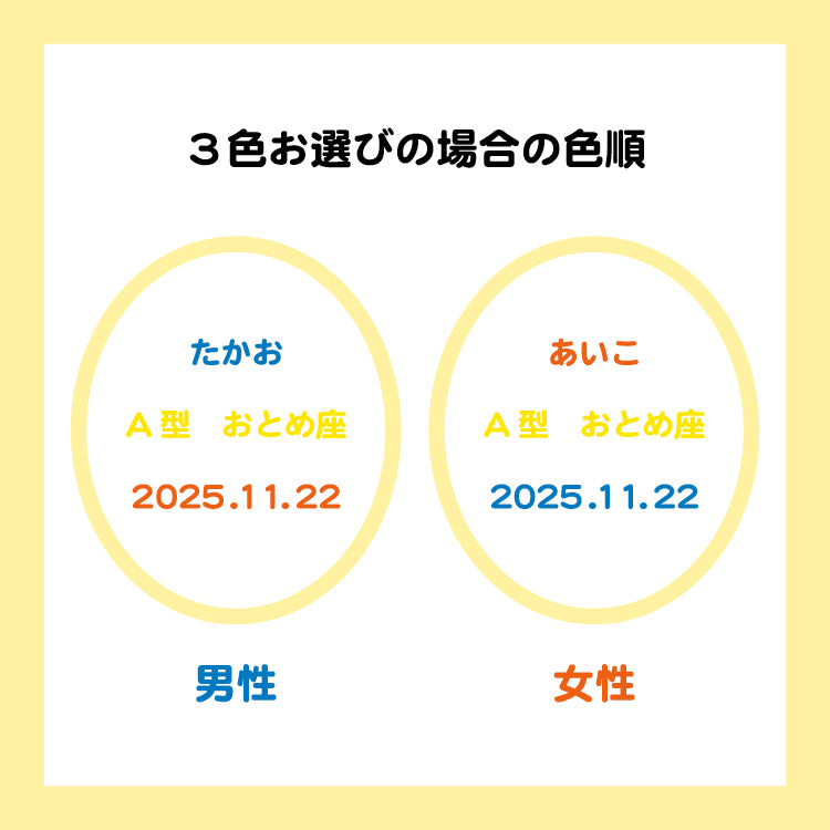 ※刺繍糸の色が3色コンビの場合、男性はブルーが一番上の段、女性はオレンジが一番上の段となります。
