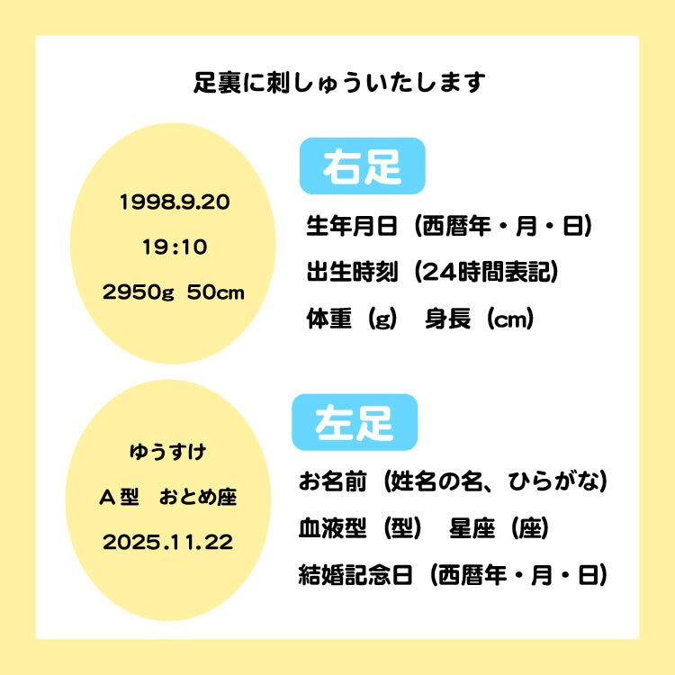 ※足裏に刺繍をお入れします。項目の変更はお受けできません。